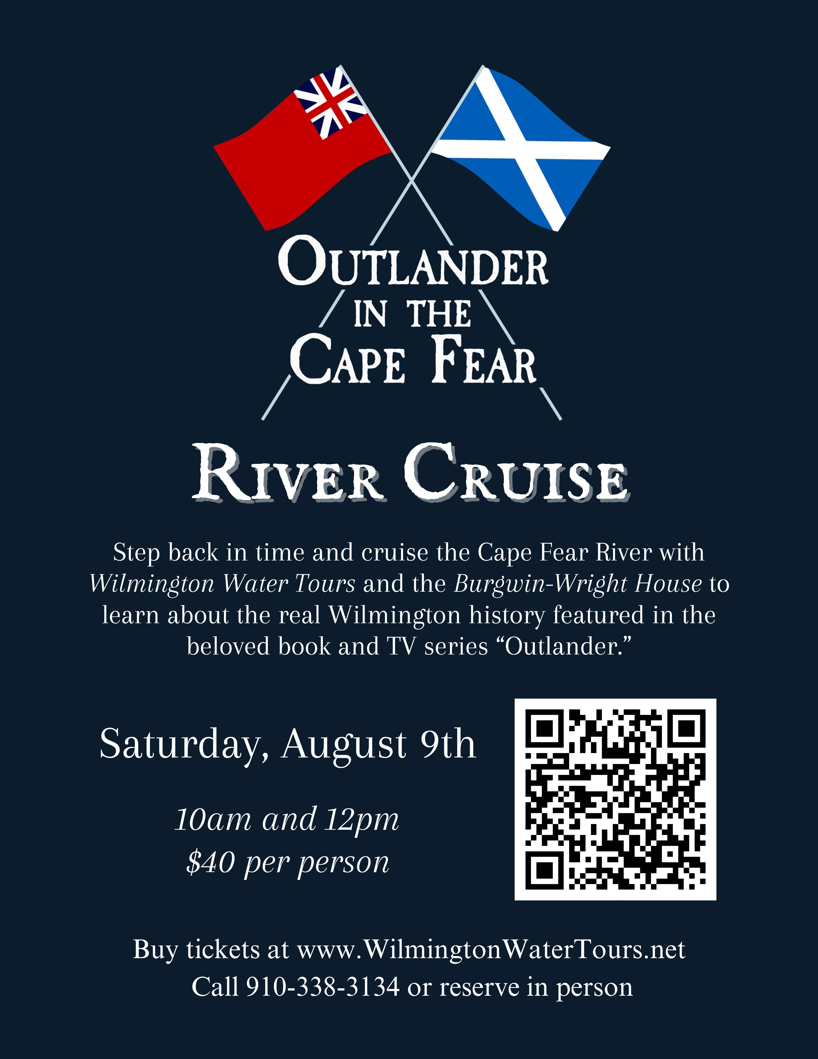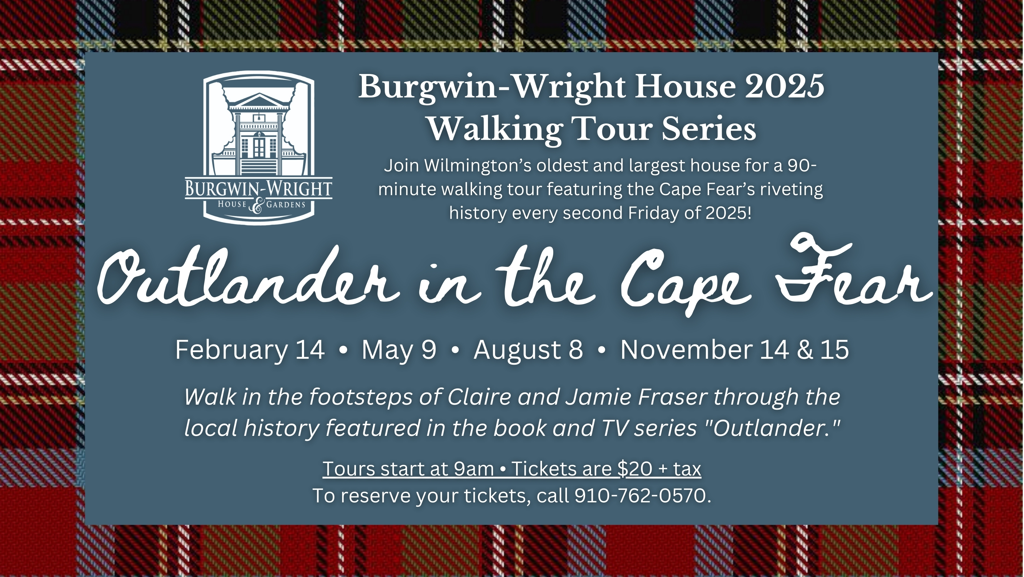 Welcome To Your Home For EVERYTHING "Outlander" In The Cape Fear And Wilmington! The Burgwin-Wright House is the oldest and largest historic site open to the public today in Wilmington, making it the perfect place to learn all about the Colonial North Carolina history that is so important to the "Outlander" book and TV series. Whether it is through our podcast, house tours, waking tours or river cruises, there are so many ways to walk in the footsteps of Claire and Jamie Fraser in Wilmington. Scroll down to learn about all the "Outlander" we offer! The best place to start is with our podcast, "Burgwin-Wright Presents... Outlander In The Cape Fear." Each episode of the podcast takes an event, character or theme from the "Outlander" series and talks about the fact behind the fiction. Listen for free on all podcast platforms including Spotify, Apple Podcasts, Google Podcasts, Stitcher, iHeartRadio, TuneIn or in the player below. "Outlander in the Cape Fear" River Cruise The thousands of real Scottish Highlanders who arrived in the Cape Fear region during the Colonial period would have first become acquainted with the Cape Fear River -- the only river in North Carolina with direct access to the ocean. It means there's no better place to learn about the real history discussed on the "Outlander in the Cape Fear" podcast than on our "Outlander"-themed river cruises with Wilmington Water Tours. Check out the future cruise dates below and purchase tickets at here.  "Outlander in the Cape Fear" Walking Tour Walk in the footsteps of Claire and Jamie Fraser with the "Outlander in the Cape Fear" walking tour through downtown Wilmington. Learn all about the history of the "Outlander" book and TV series while you walk through the historic downtown district where thousands of real Scottish Highlanders first laid eyes on the American Colonies. Details below!  |