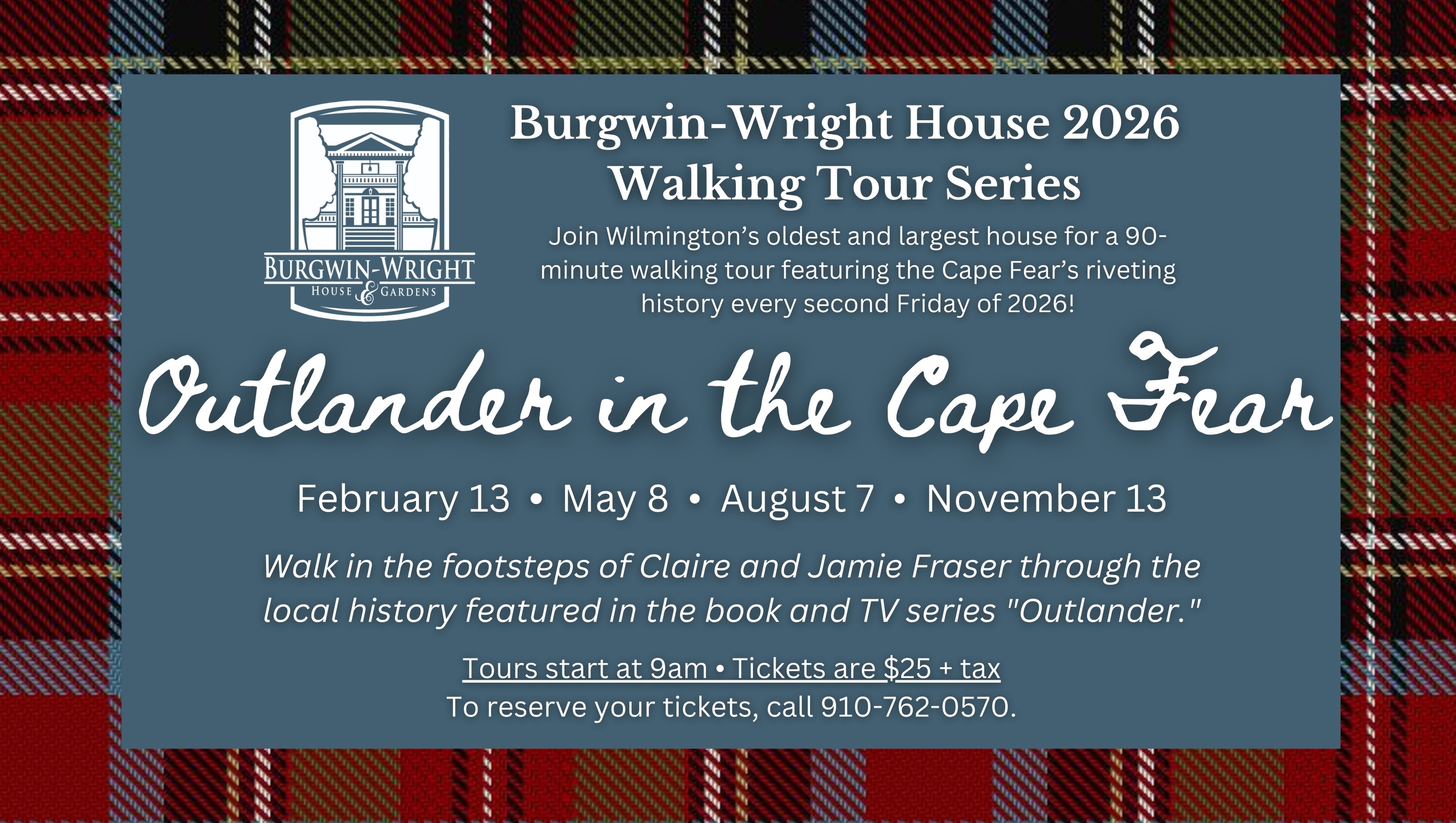 Welcome To Your Home For EVERYTHING "Outlander" In The Cape Fear And Wilmington! The Burgwin-Wright House is the oldest and largest historic site open to the public today in Wilmington, making it the perfect place to learn all about the Colonial North Carolina history that is so important to the "Outlander" book and TV series. Whether it is through our podcast, house tours, waking tours or river cruises, there are so many ways to walk in the footsteps of Claire and Jamie Fraser in Wilmington. Scroll down to learn about all the "Outlander" we offer! The best place to start is with our podcast, "Burgwin-Wright Presents... Outlander In The Cape Fear." Each episode of the podcast takes an event, character or theme from the "Outlander" series and talks about the fact behind the fiction. Listen for free on all podcast platforms including Spotify, Apple Podcasts, Google Podcasts, Stitcher, iHeartRadio, TuneIn or in the player below. "Outlander in the Cape Fear" River Cruise